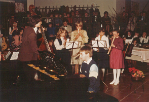 Franziska Bauer: Die Familie Thalmeier und wir – wir sind ja befreundet – wollten, dass unsere Kinder Musikinstrumente lernen. Da gab es Angebote in Mühldorf und in Dorfen, da hätte man sie hinfahren müssen. Wir haben daher 1976/77 zuerst mit [Ercole] Caputo, einem Buchbacher Musiklehrer, gesprochen. – Er ist immer noch Musiklehrer, jetzt in Burghausen, vorher in Mühldorf. Er kam aus Kassel. Damals hatte er auch eine super Tanzband! Er kannte viele Musiklehrer. Das waren gute Voraussetzungen und wir haben einen Förderkreis gegründet für die Volksschule Buchbach, jetzt heißt es Musikschule e.V. Wir haben für den entsprechenden Platz gesorgt, für Spenden, um Musikinstrumente anschaffen zu können.