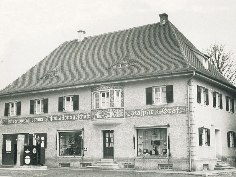 Getankt haben wir vor dem Zweiten Weltkrieg bei unser eigenen Esso-Tankstelle, vor der sehr schönen Werkstatt. Herr Graf war [1932] vom oberen Markt auf den Marktplatz gezogen. Gleich links neben dem neuen Haus war die Werkstatt mit dem Einfahrtstor. Dort haben auch die Amerikaner ihre Fahrzeuge gerichtet, selbst mit den Panzern sind sie da reingefahren. Dort gab es eine Abschmiergrube, wo sie ihre Abschmierarbeiten gemacht haben. Sonst gab es weiter keine Werkstatt in Buchbach, wo sie diese Arbeiten verrichten konnten.