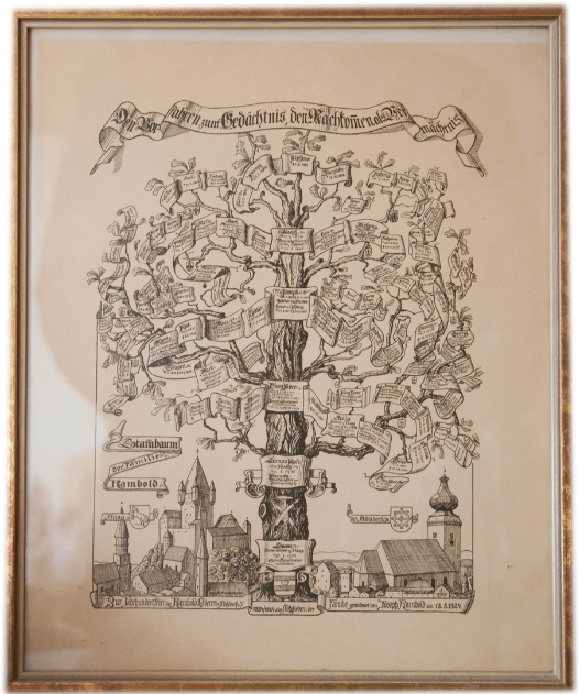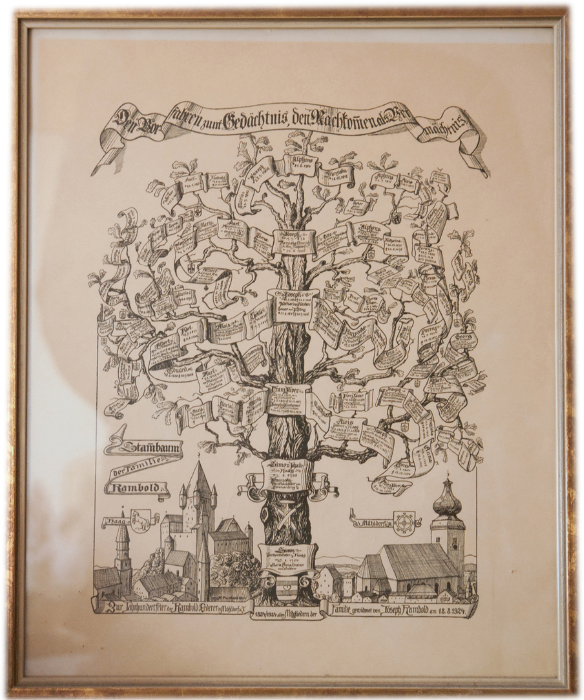 Die Rambold waren Lederer und Gerber in Haag. Um 1820 sie sind von Haag weggegangen nach Mühldorf, Pfarrkirchen und Buchbach. Noch früher sind welche von ihnen nach Südtirol ausgewandert, da haben wir auch noch ein bissl Kontakt gehabt. Zum Beispiel zum langjährigen Schriftleiter der „Dolomiten“ [Tageszeitung aus Südtirol], dem Josef Rampold, er hat zahllose Bücher geschrieben, Heimatforschung betrieben, Rundfunksendungen gemacht. Unser Zweig der Familie hat ab 1850 von „Rampol“ auf „Rambold“ gewechselt. Das haben die drunten nicht mitgekriegt, drum schreiben die sich heut noch Rampold. [schmunzelt]