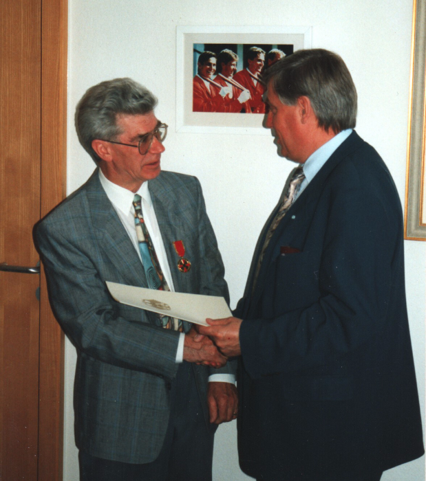 Siegfried: Ich war 28 Jahre lang Prüfer für die Meisterprüfung in der Holzverarbeitung bei der IHK in Rosenheim. Ich habe die Bundesverdienstmedaille bekommen für meine ehrenamtliche Tätigkeit als Arbeitgebervertreter bei der IHK, als Mitglied und späterer Vorsitzender der Prüfungskommission – auf Initiative meines Arbeitgebers Himolla. [Die Urkunde ist] unterzeichnet vom Bundespräsidenten Roman Herzog und übergeben von Landrat Erich Rambold. Von der IHK hab ich den goldenen Ehrenring erhalten, für meine langjährige Mitgliedschaft in der Prüfungskommission.