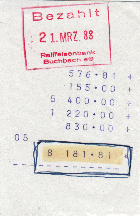 Maria: Eine Auswahl verschiedener Eier haben wir in den Schaufenstern im Markt ausgestellt. Und da wollten die Leute sie gleich kaufen. Weil wir keinen Pfarrsaal mehr hatten, es war ja alles für den Neubau schon abgebrochen, durften wir in der Raiffeisenbank am Palmsonntag die Eier verkaufen. Ein wunderschöner Tag war das, die Leute standen bereits eine Stunde vor dem Verkauf an. Der Erlös war 8.181,81 Mark. Darüber gibt es noch den Beleg.
